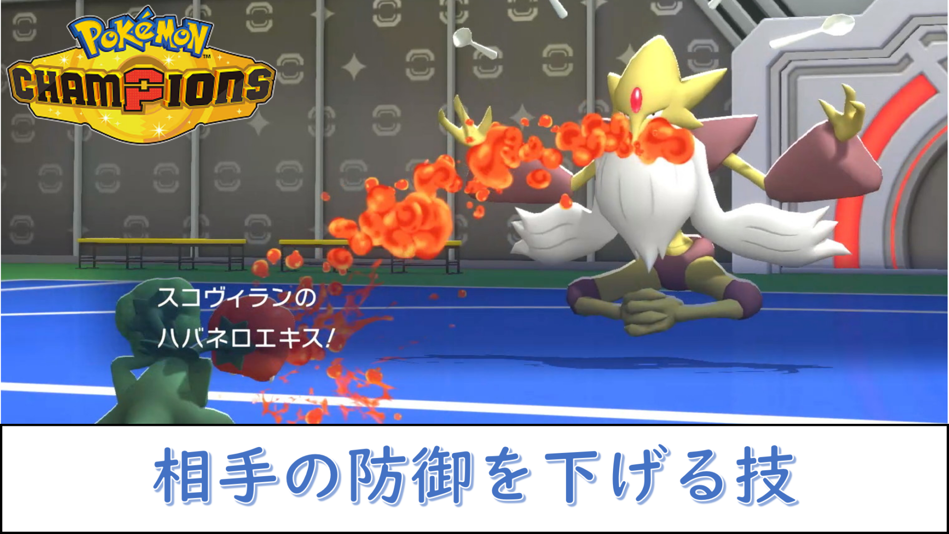『ポケモンチャンピオンズ』で使用可能な、相手の防御ランクを下げる効果のある技は次の通りです。