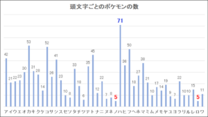 全ポケモン1025種類を、名前の頭文字ごとにカウントすると下のグラフのようになります。