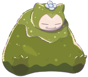 からだに苔が生え、頭の上には花が咲いているように見えるカビゴンです。