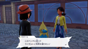 ポケモンセンター:ローズ広場の近くにいる、ライボルトを連れた女性に話しかけると依頼開始です。