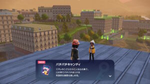 屋上を進んだ先にいる少年に話しかけ、「カナリィパン」を渡すと「パチパチキャンディ」を交換してくれます。(他のアイテムを渡すとランダムで道具と交換してくれます)